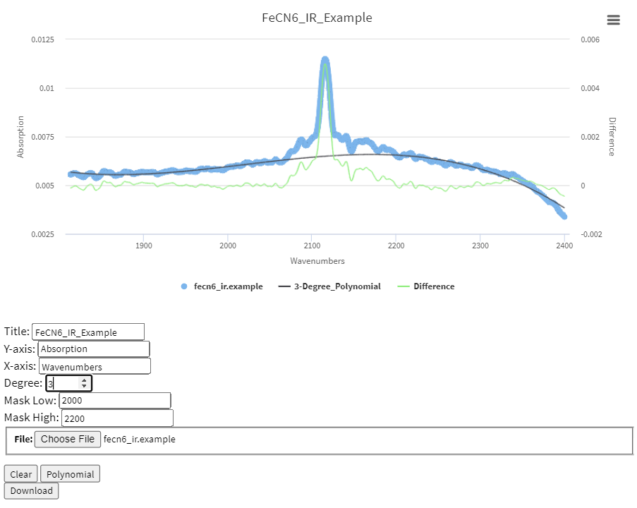 The polynomial fitting tool utilizes Gauss-Jordan elimination to minimize a polynomial to a dataset. The data can be masked by parameters Mask 1 and Mask 2 (for the x range to mask). The data should be uploaded in the comma-delimited format without comments in the file. Greater than two columns will be ignored.